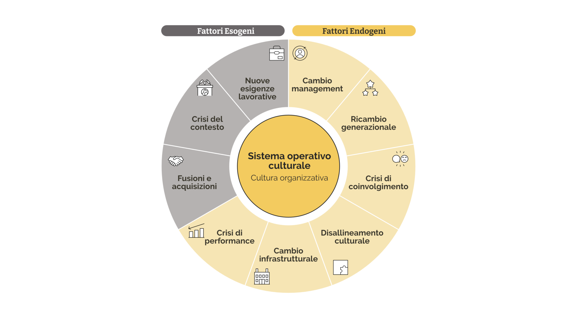 I fattori che determinano la necessità di una riprogettazione culturale sono molteplici: nuove esigenze lavorative, crisi del contesto, fusioni e acquisizioni, crisi di performance, cambio infrastrutturale, disallineamento culturale, crisi di coinvolgimento, ricambio generazionale, cambio management.
